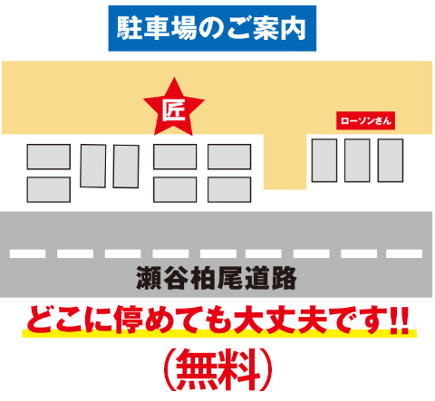 空いている場所であれば何処でも駐車可能ですのでお車でのご来店もお待ちしております。